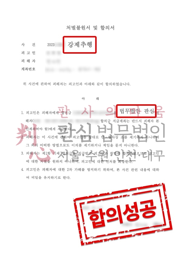 판심은 의뢰인을 대리하여 모든 피해자들과 합의를 이끌어냈고, 다행히 신고를 하지 않는 것으로 사건을 종결시켰습니다.