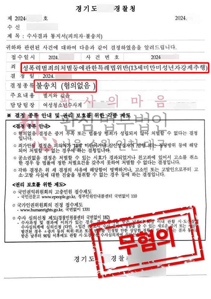 사건을 담당한 경찰서는 이와 같은 변호인의 의견을 전부 인정하며 의뢰인에 대해서 무혐의 불송치 처분을 내려주었습니다.